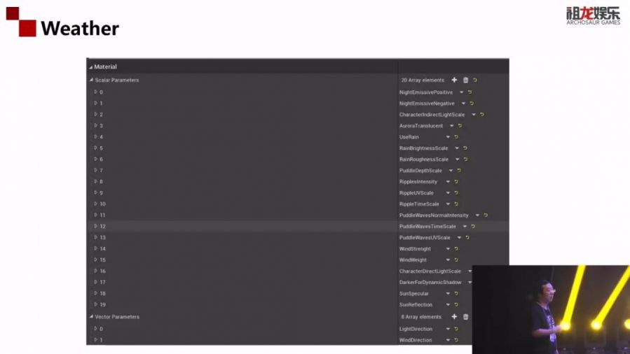再讲一下参数集。这个参数集我并不想特别展开每一项参数的意义。因为每一个游戏,它天气效果的渲染是非常复杂的一个图表,会使用不同的参数。我现在只讲一下它使用的思路。