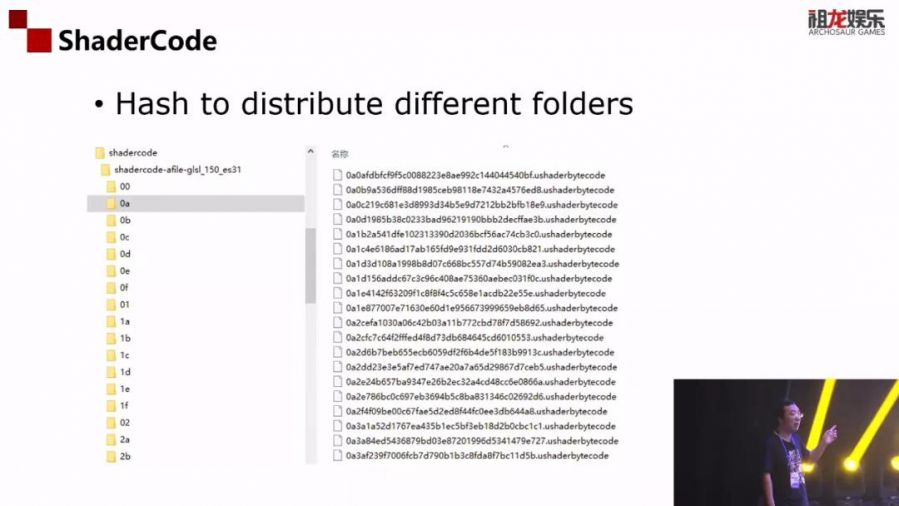 这是改进之后的长相。因为文件特别多,有几万个文件,在开发期的时候必须要做一个文件夹的映射。因为几万个文件都存在一个文件夹里的时候,查看会卡很久。所以我们通过ShaderCode的文件名哈希出来,把它分摊到若干个目录里去,这样每个目录的文件数量不是很多。