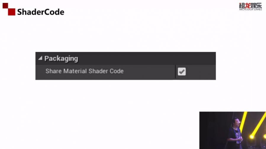 我讲一下ShaderCode。这个ShaderCode呢,是当你把材料球连好之后、质量等级建好了之后,他会编译出很多的变种。因为你的Shader Type不一样,你的顶点结构不一样,你的质量等级不一样,他会变出很多变种。这些变种都会变成一个二进制的数据,有两种存储方式,在UE里面需要设置。
