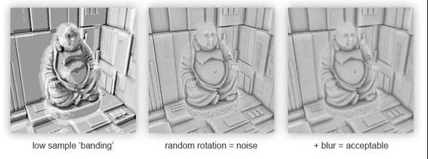 很明显,渲染效果的质量和精度与采样的样本数量有直接关系。如果样本数量太低,渲染的精度会急剧减少,会得到一种叫做波纹(Banding)的效果;如果它太高了,会影响性能。通过引入随机性到采样核心(Sample Kernel)从而减少样本的数目。通过随机旋转采样核心,能在有限样本数量中得到高质量的结果。然而随机性引入了一个很明显的噪声图案,需要通过模糊降噪来修复这一问题。下面这幅图片展示了波纹效果还有随机性造成的效果: