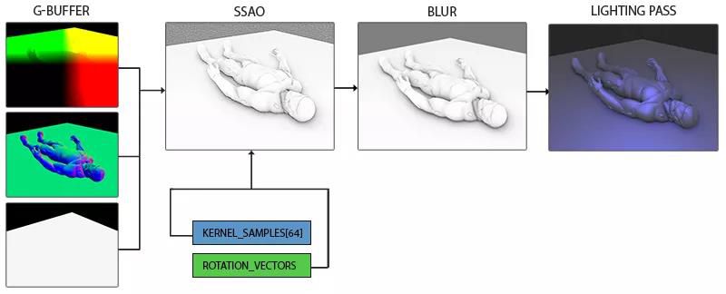 现在的效果仍然看起来不是很完美,不连续的噪点清晰可见,为了创建一个光滑的环境遮蔽结果,需要模糊环境遮蔽纹理进行降噪。