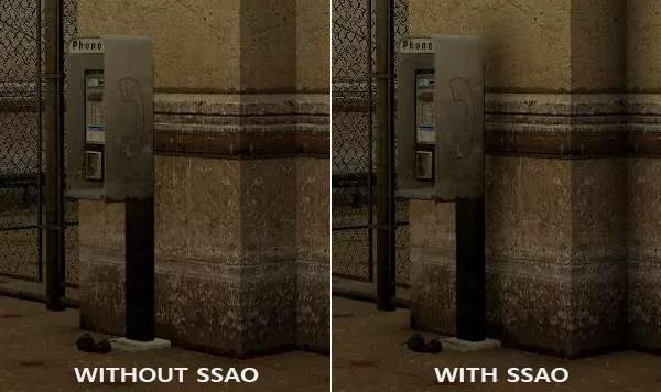 下面这幅图展示了在使用和不使用 SSAO 时场景的不同。特别注意对比电话亭后面和墙角部分,你会发现(环境)光被遮蔽了许多: