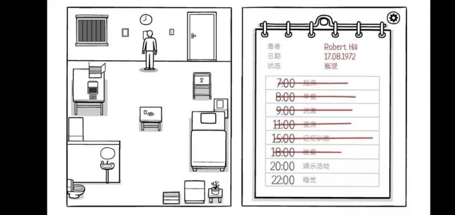 而你所扮演的角色,本身就在过着高度程序化的生活:主人公名叫 Robert Hill,患了严重失忆症,他需要遵循严格的日程安排,每天定时完成起床、洗漱、就餐、查房、记忆训练、娱乐活动、探寻梦境,直到康复离开精神卫生中心。