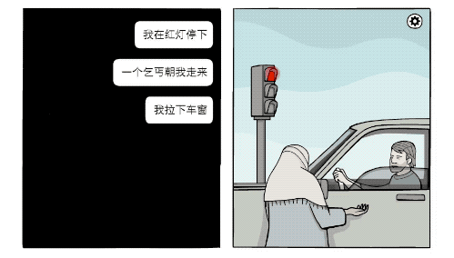 主人公说:「一个乞丐朝我走来,我拉下车窗,给了她一个硬币。」话并不难懂,你知道手指先后滑向车窗、老妇人的手,这系列操作便算完成。