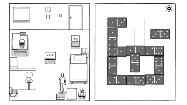 稍有挑战性的谜题,通常在「查房」、「记忆训练」和「娱乐活动」环节中。所谓查房,是有护士、医生来询问个人信息,比如姓名、住址之类;所谓记忆训练,通常就是找茬;而娱乐活动会较为丰富些,有举杠铃,有颠球,有拼图,每天花样翻新。