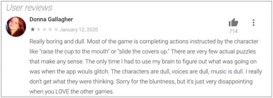 有条被大量点赞的负面评价如此写道:「真心无趣。大量游戏内容就是像完成『刷牙』或『滑上盖子』这样的人物动作。真正有意义的谜题太少了。我只有在 App 出 Bug 的时候才会去动脑筋,想想到底怎么回事……」