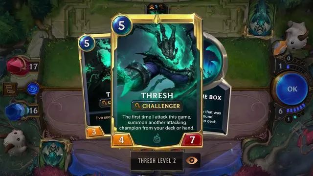 - 英雄(Champion)是单位牌中一个特殊的群体,通过完成牌上写的小任务,比如在一整局中击晕(Stun)一批敌人,或是见证一定数量单位被击败,英雄牌就能在本局中永久升级,除了能获得更有魄力的卡面,数值与效果也会更上一层楼;一套上限 40 张的牌组中最多只能有 6 张英雄牌,这些“怪物”身背从《LoL》移植过来、符合角色气质的强悍技能,有的能满血复活,有的能召唤衍生物,有的能生成高威力法术,还有的甚至能在完成苛刻条件后直接取胜;带哪些英雄上战场,如何围绕英雄特点搭建出顺滑的套路,值得每位玩家思考、玩味。