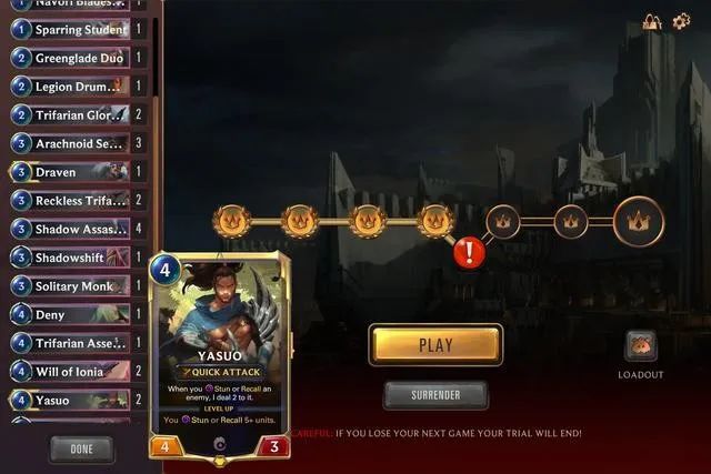 一来,在远征过程中,每局结束后玩家都有机会交换最多 3 张已选牌,部分关键场次结束后还能有选择地扩充远征卡组,慷慨地给予了玩家动态调整构筑、修正错误的机会。二来,一次远征其实由两次“试炼(Trial)”组成,每次试炼胜场的上限是 7,取两次试炼中胜场成绩最好的一次,作为本次远征的最终成绩,一次试炼结束也不是看累计输了几局,而是规定连败两场结束;很显然,从赛制规则的角度看,《LoR》给了玩家充足的回旋余地。如果你一周花钱打了三次远征,恭喜你,本周接下来的时间里你都可以免费、无限制地进行远征,热爱“竞技场”的朋友们,你们心动了吗?