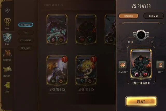 本作目前有构筑(非正式名)和“远征(Expedition)”两种游戏模式,前者需要玩家用自己获得的卡牌组成套牌对战,一套 40 张、同名卡不超过 3 张,后者则是在缴纳入场费后用系统给出的卡牌填充卡组、谋求连胜。接下来的内容会主要围绕构筑模式展开,对局体验一致但赛制特殊的远征模式留到晚点再提。