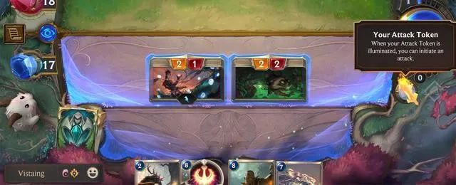 - 更有互动空间的攻守。首先,防守方有很可观的主动权,《LoR》中阻挡单位需要与宣告进攻的单位一一对应,未被阻挡的攻击会直接伤害对手,但“谁挡谁”可以由防守方决定,这就让防守方更能够掌控单位交换的结果。其次,开发团队创造性地加入了“攻击令牌(Attack token)”这一要素,游戏会在每轮开始时为优先行动的一方生成一枚攻击令牌,持有令牌方能主动进攻,宣告攻击将会消耗令牌,未使用的令牌也会在一轮结束时被清除;除了等着刷给自己,玩家还能靠特定卡牌自行生成额外的攻击令牌,打出在对方先手轮进攻、在己方先手轮多次进攻等奇效,反之,在条件允许时放弃进攻、维持单位血量、诱敌深入,亦不失为智慧之举。