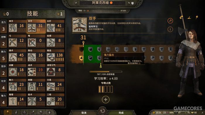 《骑砍2》则摒弃了这个思路,而采取了《天国:拯救》或者《Kenshi》类似的设计,每一种技能的等级增长,只和与这个技能相关的实践行动相关。当你统率大军,士气高昂的时候,就能增长统率的技能;当你和贵族进行社交、讨价还价的时候,就能增长魅力技能;当你用武器杀人时,就会获得对应武器类型的技能经验。每一个技能都按照经验梯度模型设置了增长曲线,而玩家角色的等级则是以你所有的技能点数之和作为你角色等级的经验。