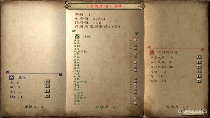 玩家在通过一系列初期检定后会获得一个初期属性值。一个力量型的角色会考虑穿着重甲拿着重型武器折冲杀敌;而敏捷型角色则常常会选择轻骑快马,甚至骑射制敌。智力型的角色精通物品管理或者医学工程学,能够为部队提供后勤支持;魅力型角色则是天然的统帅,可以统领比别人更多的军队。