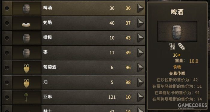 首先,价格会随着供需关系有一定的浮动。某种资源的原产地价格相对较低,而原产地一般是村镇——村镇的农民会定期将村庄里的商品买到附近的城市,这就构成了城市里的商品供给。而不同城市之间的商品交换则由商队来完成,商队基本上会自动寻找最佳盈利的贸易路线。比如从一个盛产原木的地方购买原木,卖到缺少原木的城市。
