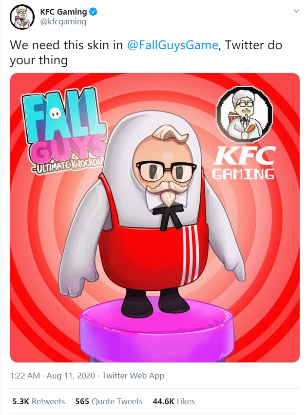 《糖豆人》卡通、搞怪的形象让它对于年轻观众和那些想要跟没有暴力元素的游戏合作的品牌有很高的吸引力,在社交媒体上,有很多来自不同领域的品牌都主动向《糖豆人》示好,表示出合作的意愿,包括KFC、沃尔玛、甚至是俄罗斯联邦储蓄银行等等。