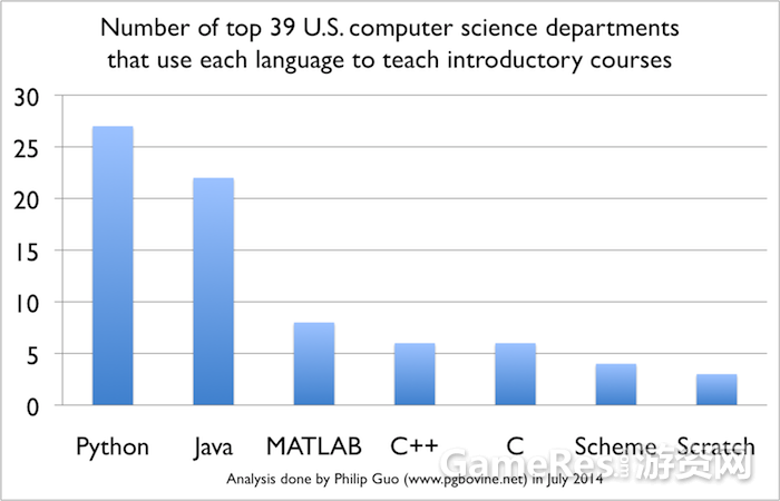 Python 已经成为越来越多美国顶级大学的计算机编程入门语言了。三年前,Mark Guzdial 曾撰写博客,预测 Python 在未来将成为主流的计算机编程入门语言。而现在,这个预言基本已经实现了。美国计算机排名顶尖的麻省理工大学和加州大学伯克利分校最近已经将他们的计算机编程入门教学语言改为了 Python。三大 MOOC 提供商(edX、Cousera、Udacity)都提供使用 Python 教学的计算机编程入门课程。同时,不同专业领域的教授,比如 Lorena Barba,也都倡导使用 Python 作为入门语言进行教学。