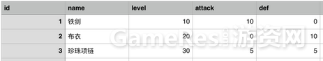 这就简单的制作了一个装备数据表,每件装备我们假设它有5个属性: