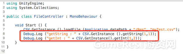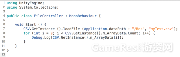 首先我们在Start函数中,通过CSV的实例调用loadFile方法来读取我们的myTest里面的内容,loadFile方法有两个参数,一个是路径名,一个是文件名称,关于路径名的一些注意事项,会在后面的扩展阅读里面介绍,这里只要理解我们通过路径名+文件名就可以指定需要读取的文件了