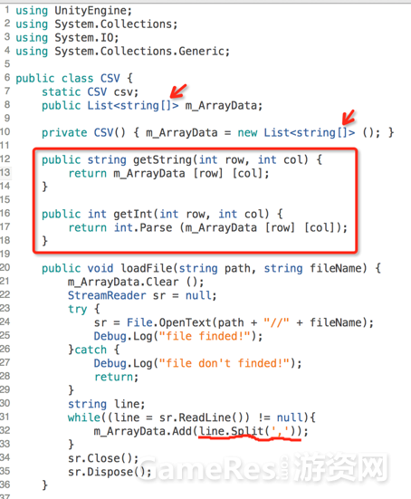 接着我们定义了csv和m_ArrayData两个成员变量,第一个用来实现单例模式,第二个用来保存从文件读取的内容。