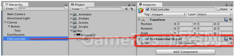 写完代码,保存一下,然后我们在创建中新建一个空的GameObject,命名为FileController,并且为挂载一个新的脚本文件FileController,用来控制文件的读取。