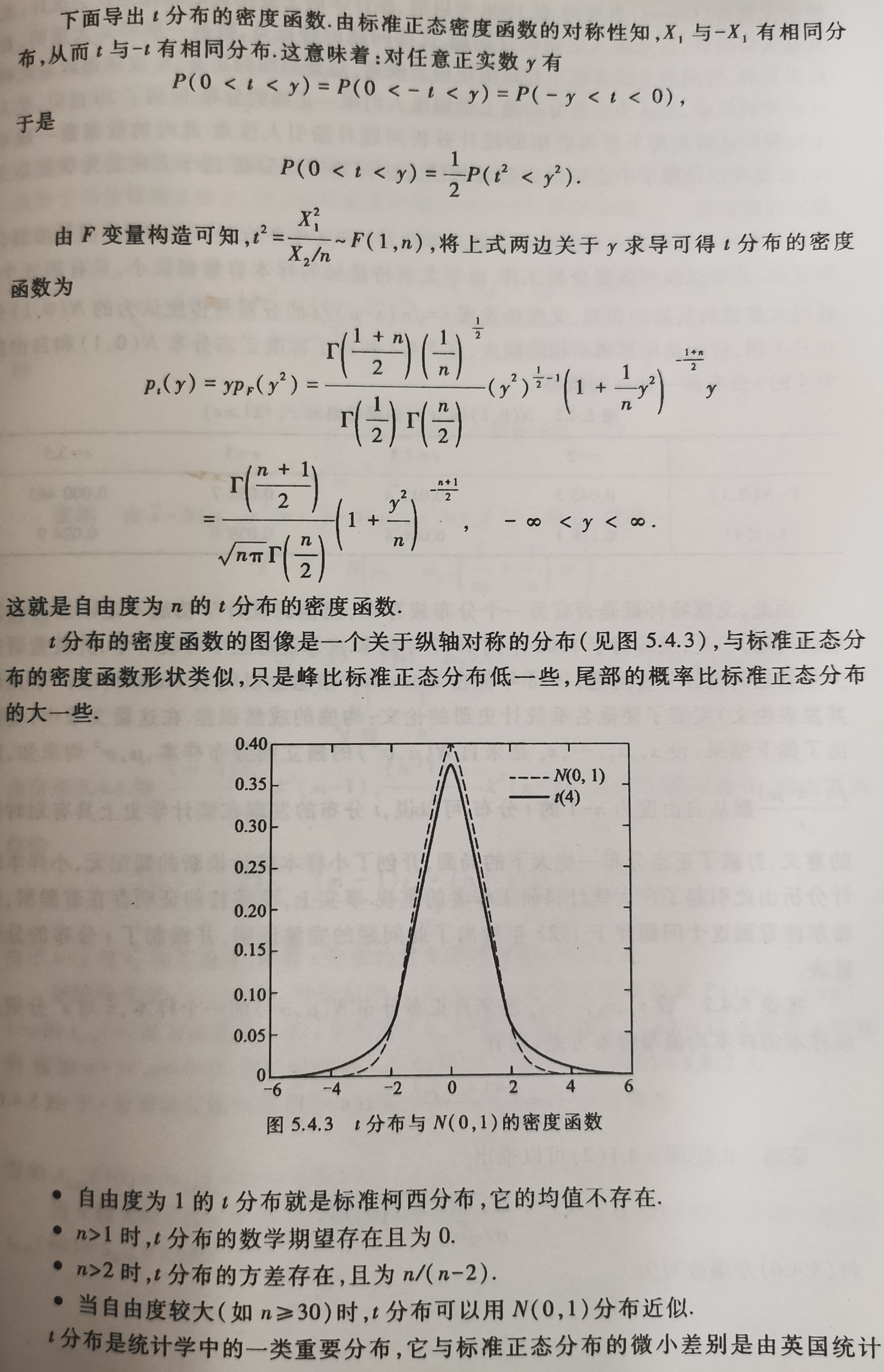 定义:设随机变量X1与X2独立且X1~N(0,1),X2~X^2(n),则称t=X1/sqrt(X2/n)的分布自由度为n的t分布,记为t~t(n)