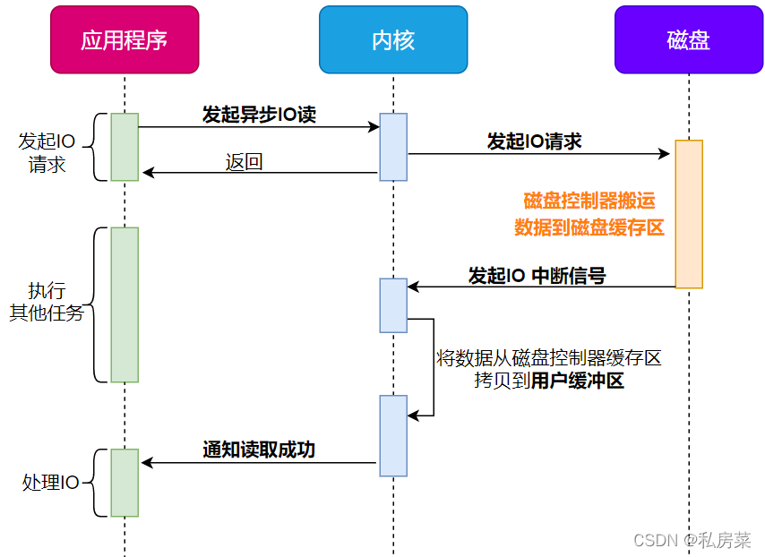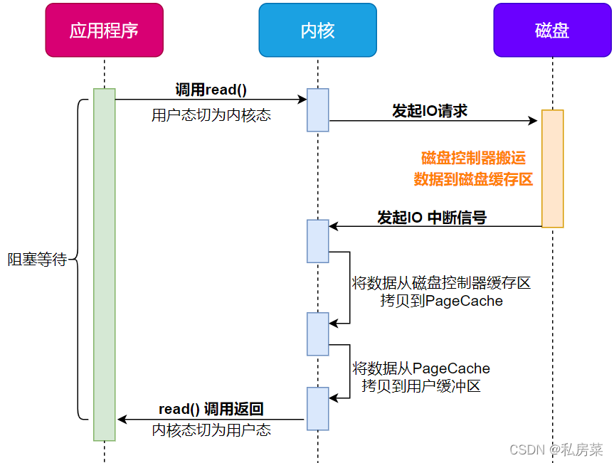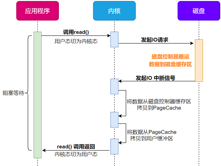 - CPU收到磁盘控制器的I/O中断之后,开始拷贝数据,完成之后read()返回,再从内核态切换到用户态;