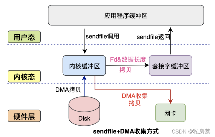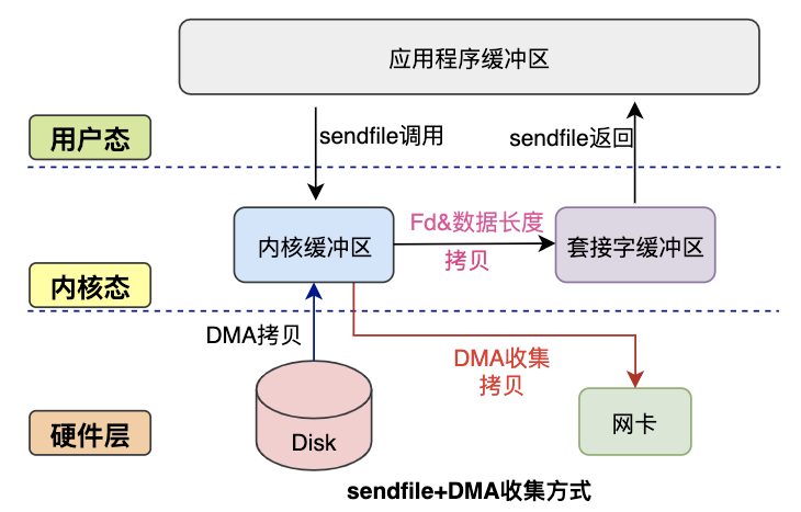 从图中可以看到,应用程序只需要调用sendfile函数即可完成,只有2次状态切换、1次CPU拷贝、2次DMA拷贝。