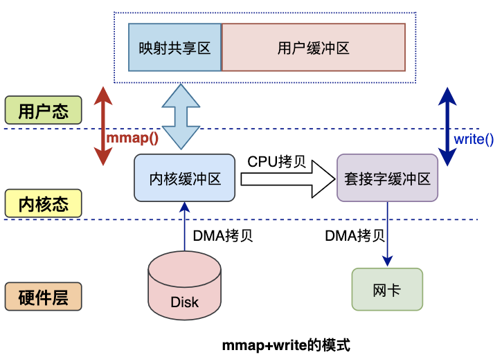 mmap+write方式有一定改进,但是由系统调用引起的状态切换并没有减少。