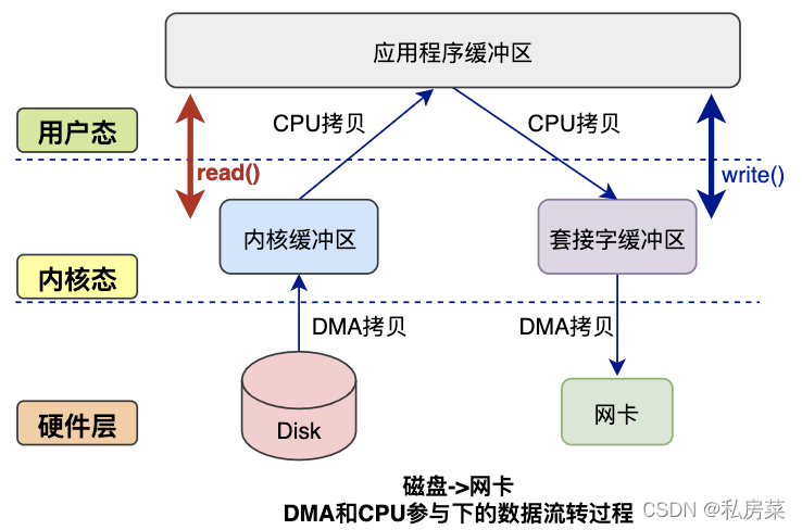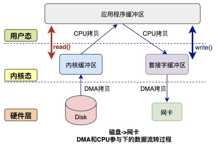 我们可以看到,如果应用程序不对数据做修改,从内核缓冲区到用户缓冲区,再从用户缓冲区到内核缓冲区。两次数据拷贝都需要CPU的参与,并且涉及用户态与内核态的多次切换,加重了CPU负担。