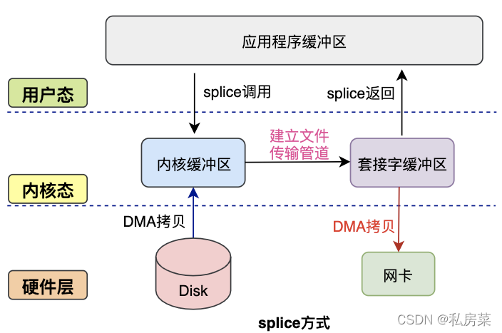 splice系统调用是Linux 在 2.6 版本引入的,其不需要硬件支持,并且不再限定于socket上,实现两个普通文件之间的数据零拷贝