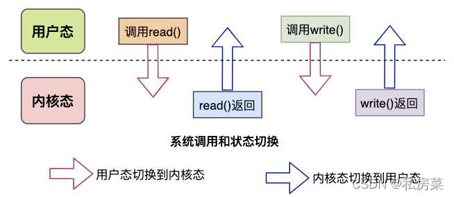 首先,期间共发生了 4 次用户态与内核态的上下文切换,因为发生了两次系统调用,一次是 read() ,一次是 write(),每次系统调用都得先从用户态切换到内核态,等内核完成任务后,再从内核态切换回用户态。