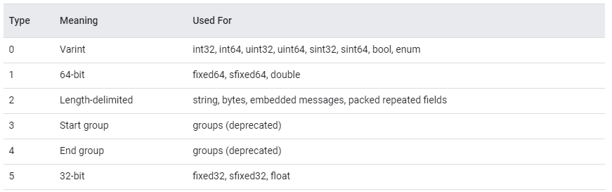 public static final int WIRE_TYPE_VARINT = 0;public static final int WIRE_TYPE_FIXED64 = 1;public static final int WIRE_TYPE_LENGTH_DELIMITED = 2;public static final int WIRE_TYPE_START_GROUP = 3;public static final int WIRE_TYPE_END_GROUP = 4;public static final int WIRE_TYPE_FIXED32 = 5;