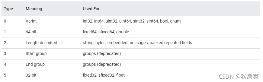 不同wire type 会导致value 以不同的方式存储,下面会详细说明。这里需要记住一点,field number 和wire type 会组成key,后期解码也会根据这个key 确认对应的value 占用空间和value 值。