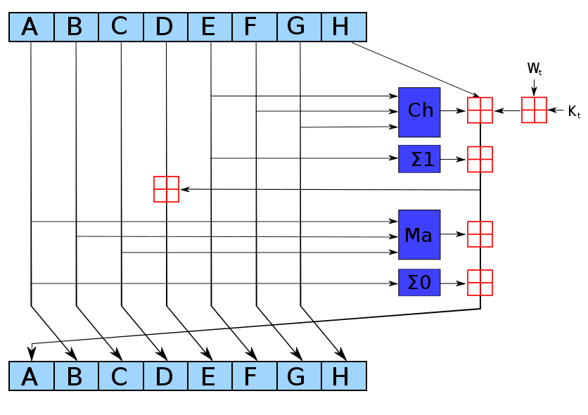{unsigned int s0, maj, s1, ch, t;unsigned int a = atemp;unsigned int b = btemp;unsigned int c = ctemp;unsigned int d = dtemp;unsigned int e = etemp;unsigned int f = ftemp;unsigned int g = gtemp;unsigned int h = htemp;for (unsigned int i = 0; i < 64; i++){s0 = Sigma0(a);maj = Ma(a, b, c);s1 = Sigma1(e);ch = Ch(e, f, g);t1 = h + s1 + ch + k[i] + M[i];h = g;g = f;f = e;e = d + t1;d = c;c = b;b = a;a = t1 + s0 + maj;}atemp=a+atemp;btemp=b+btemp;ctemp=c+ctemp;dtemp=d+dtemp;etemp=e+etemp;ftemp=f+ftemp;gtemp=g+gtemp;htemp=h+htemp;