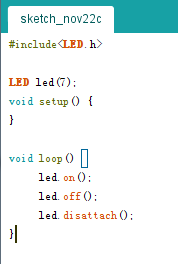#include//注意,由于LED控制模块已经是标准库了,所以使用尖括号<> 包含LED led(7); byte count =0; void setup() { Serial.begin(9600); } void loop() { if(count<10){ led.on(); delay(300); Serial.println(led.getState(),DEC); led.off(); delay(300); Serial.println(led.getState(),DEC); ++count; if(count==10) led.disattach(); } }