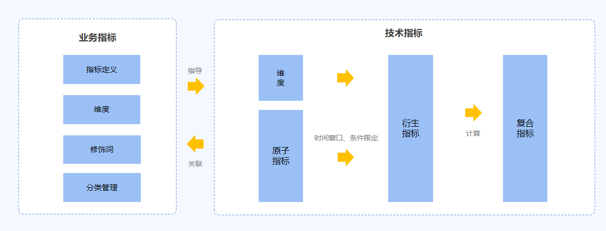 系统在做指标管理时,往往要做指标的分类管理,用于指标的分层,便于归类管理。另外,系统会从业务视角,增加业务指标的管理。业务指标往往是一些描述性文字,定义指标设置的目的、计算公式、统计周期,统计维度等,用于指导技术指标的建设。