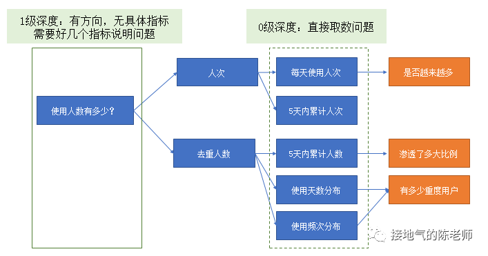 1、主语是:过去5天使用过A功能的用户。那得先知道有多少人在用?第1级深入的数据,这里都需要加上。