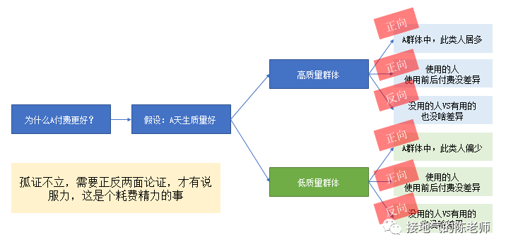 即使看到数据:A群体消费天然比不用的高,还是有至少这4种可能性要排除。所以得列清楚假设逻辑树,逐一排查可能性。这也是我们说的:验证观点,需要同时找正反两面的例子。