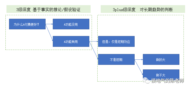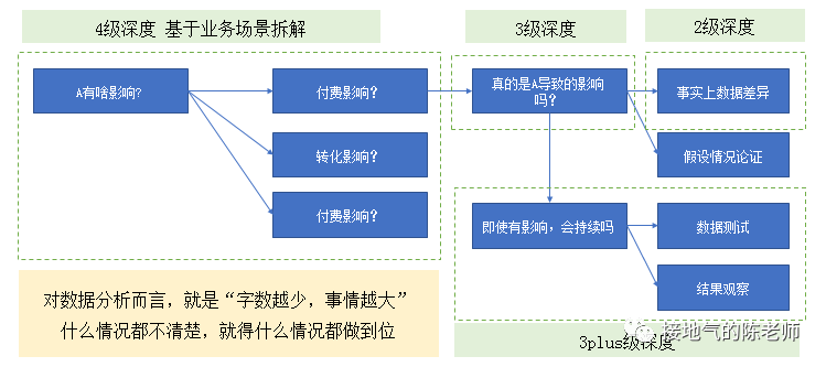 某天,你又收到一个需求:“分析下为啥使用A功能的人付费更好?”注意,先问是不是,再问为什么,是回答问题的基本要求。因此在拆解问题的时候,得先把深入2级功课都做完。做实了“A的付费更好”以后再分析原因。
