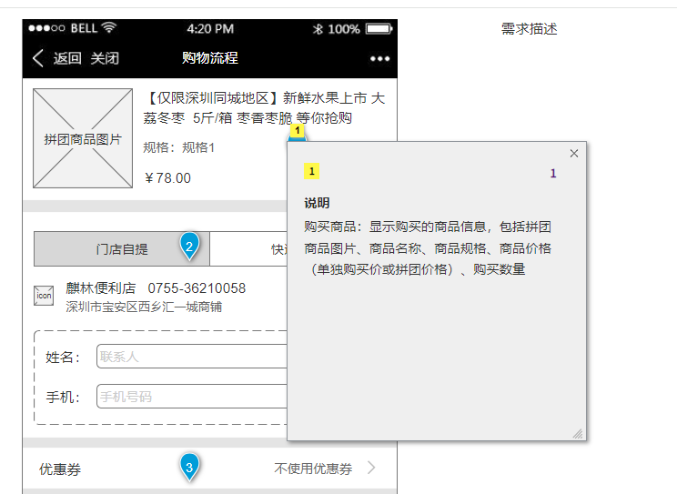 与箭头标注法类似,在界面左右两侧添加标注文字。与箭头标注法不同的是这种标注方法没有直连连接,而是利用Axure自带的圆形标记或水滴标记给标注对象和标注文字进行编号,需要注意的是标注对象和标注文字的编号要保持一致,否则将影响文档的易读性与理解成本。