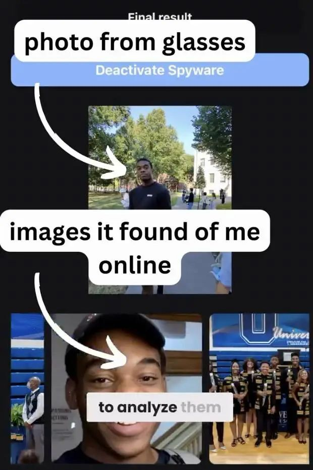 随后,在互联网上搜索到某个人的更多照片,以及基于公共数据库,查找这个人的姓名、住址、电话号码,甚至亲属信息。最后,这些信息会传送到他们编写的一个手机 app,方便查看。