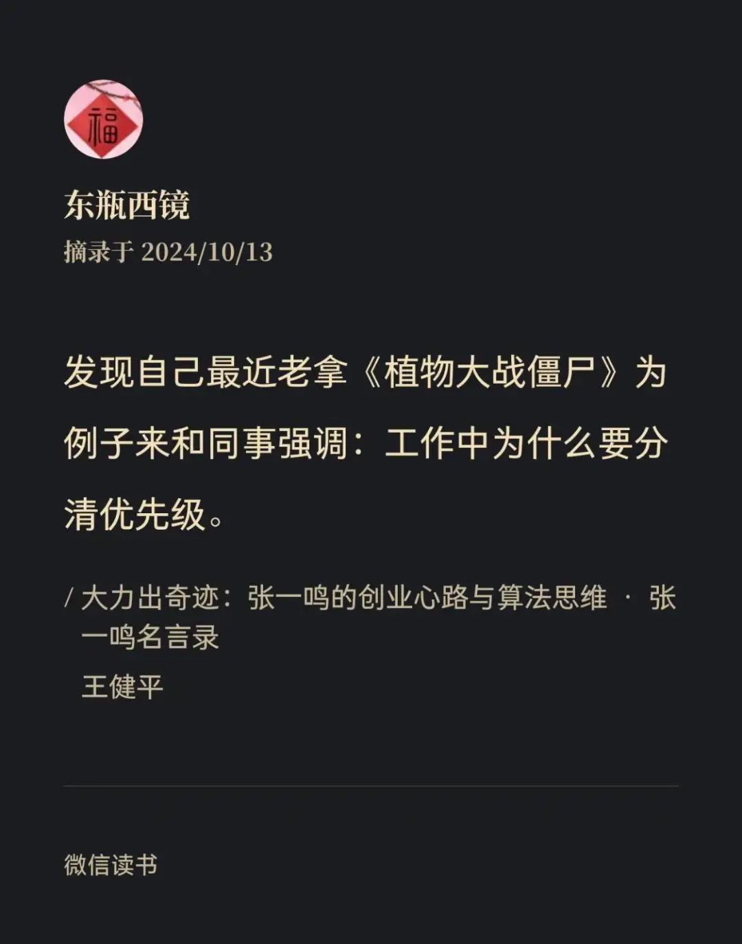 在书中,一鸣同学对优先级思维打过一个很形象的比喻,他说喜欢用植物大战僵尸来强调工作中要分清优先级,必须时刻知道哪些事情是是先要去做的。