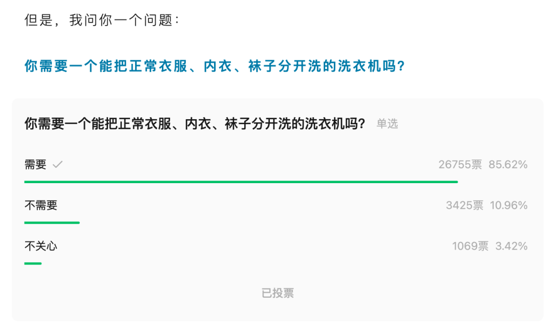 《小米出了分区洗衣机,雷军才是用户之神!》文章内的投票超过30000人、留言条数有300多条、转发有3700多人。