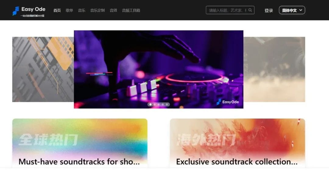 目前,EasyOde的官网功能架构并不复杂,共分为5个板块,歌单、音乐、音乐定制、音效、音频工具箱。大陆用户目前无法注册。