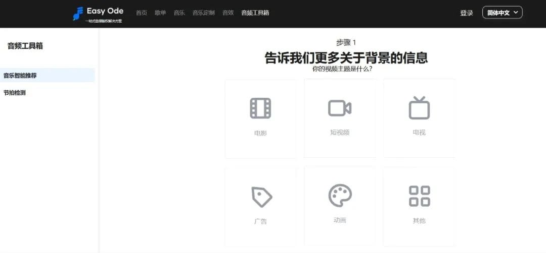 官网显示,EasyOde平台可为媒体项目提供“高质量的音乐和音效”,拥有60000首版权曲库,平台允许用户上传视频内容以获取AI驱动的音乐推荐,并提供定制化服务以制作个性化作品,用户还可以上传参考曲目进行分析。