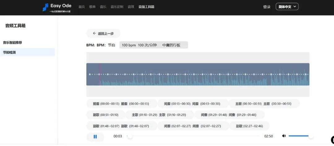 音频工具箱就比较有意思了,分为音乐智能推荐和节拍检测两个选项,用户可以通过上传视频素材,EasyOde会自动从其曲库中推荐与视频内容视频的曲目;用户还可以通过节拍检测工具上传音频,系统会自动识别歌曲的整体结构、BPM等。