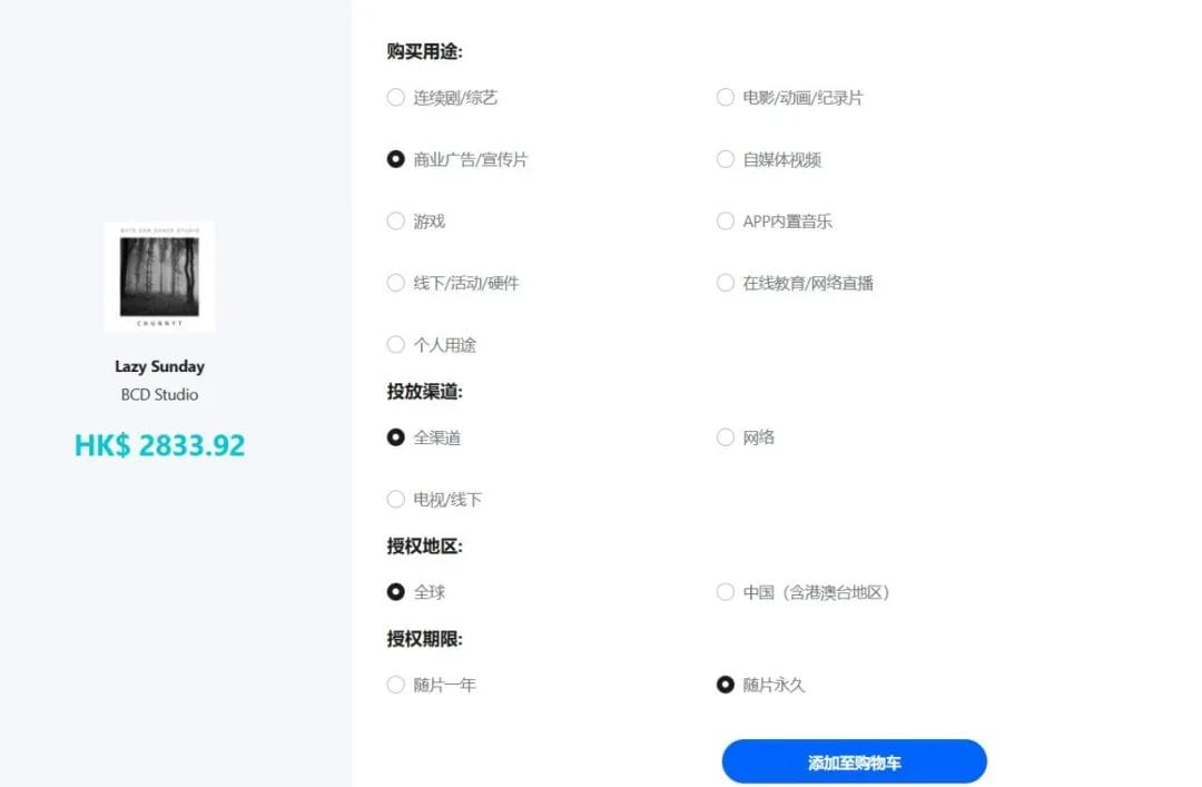 目前,EasyOde的定价模式相对单一,仅限按需购买、音乐定制。以平台上的歌曲《Lazy Sunday》的商业广告用途为例,若用户选择全渠道、全球授权、随片永久的定价在2833.92元港币(约2550人民币)。