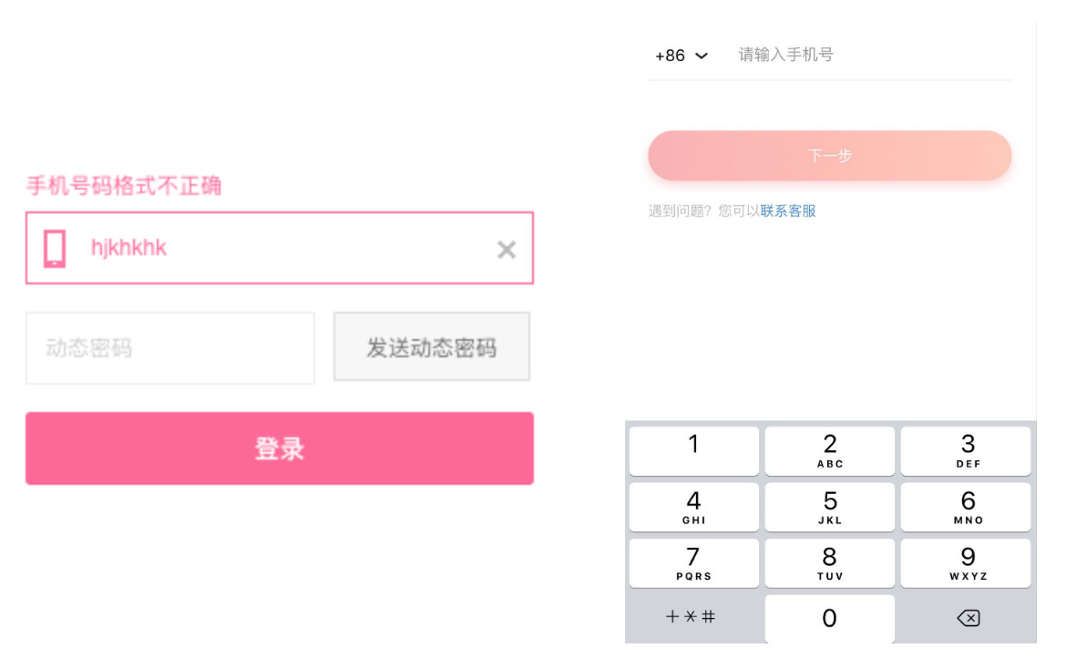 部分输入框可考虑实时数据校验反馈,移动端可通过定制键盘类型来规避部分问题出现。如:账号形式是手机号码,PC端可实时校验是否符合手机号码格式,移动端可定制该输入框的键盘为数字键盘。