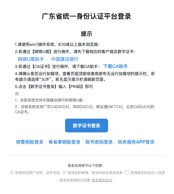 部分系统对信息安全性、涉密性要求较高(如政务领域),则可采取 CA 电子认证服务,通过验证数字证书信息来实现验证用户身份,从而进行登录。