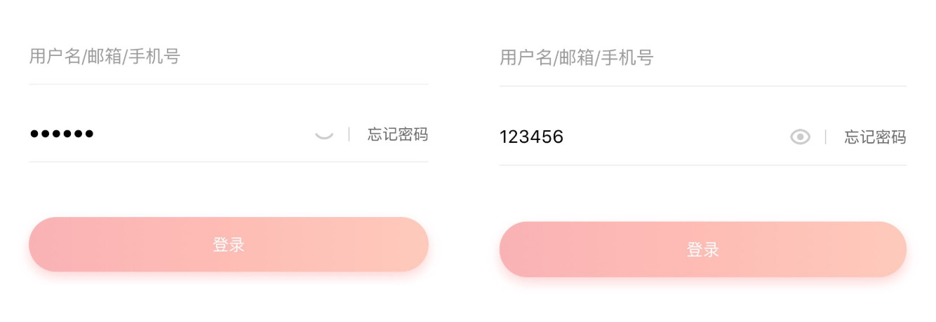 信息项可根据需要找到适合的显示格式。如:账号为手机号码,则输入框可采用用户熟悉的 334 格式。密码则根据场景定初始化为明暗文,附上切换按钮。