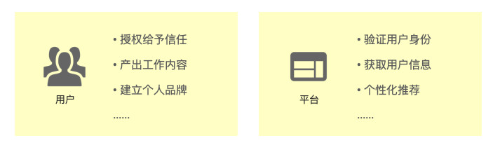 - 授权给予信任,在用户登录到平台的动作时,相当于将自己身份信息授权于平台使用,是对平台一种信任的体现。